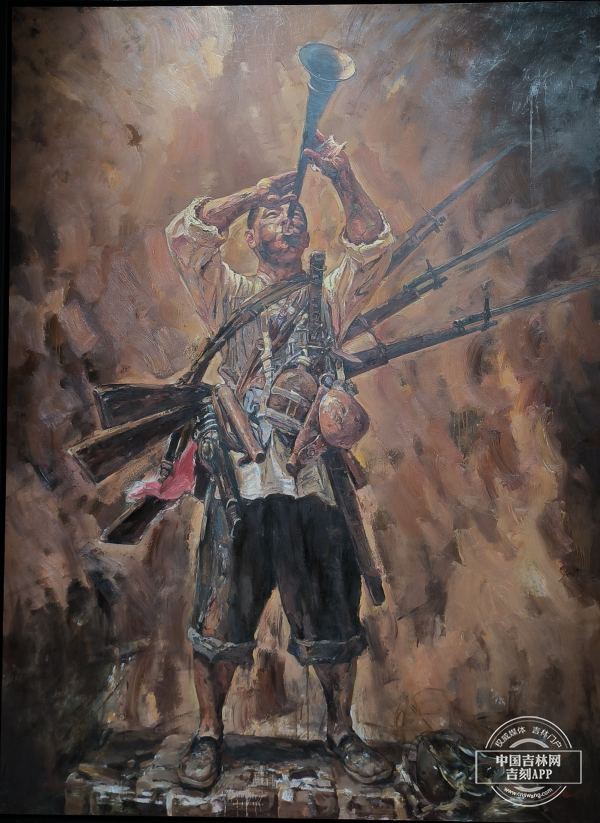 创创作者弱化了背景,用暖色调强化胜利氛围,发挥油画凝重的表现力,暖色调映衬下,战士表情坚毅,身体如雕塑,充满凛然之气,象征中华民族威武不屈、勇于斗争的时代精神。